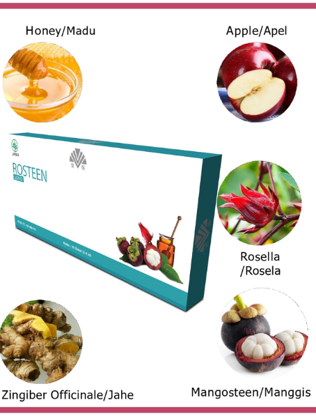 Rasakan manfaat alami dari Madu, Apel, Rosella, Manggis, dan Jahe dalam ROSTEEN. Diformulasikan dengan cermat, ROSTEEN adalah solusi komprehensif untuk meningkatkan daya tahan tubuh dan menjaga kesehatan optimal Anda.