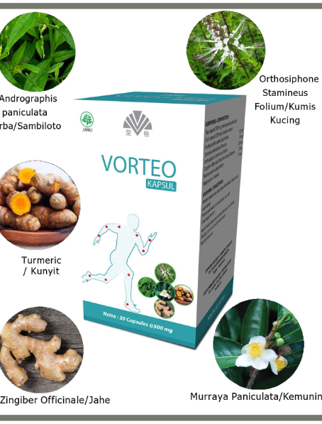 VORTEO KAPSUL adalah formulasi kuat dari Andrographis paniculata herba (Sambiloto), Turmeric (Kunyit), Orthosiphone Stamineus Folium (Kumis Kucing), Zingiber Officinale (Jahe), dan Murraya Paniculata (Kemuning). Dirancang untuk meredakan berbagai gejala tidak nyaman terkait persendian dan otot, VORTEO membantu Anda bergerak lebih bebas.
